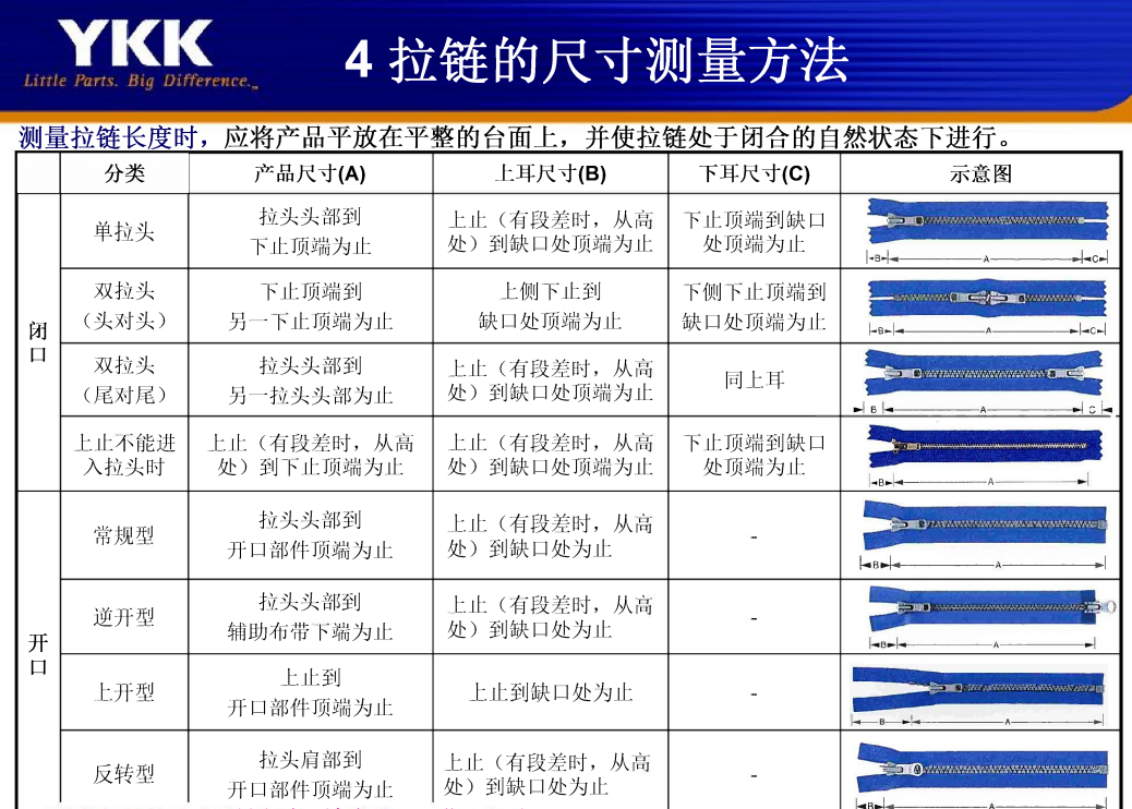 YKK拉链的尺寸测量方法