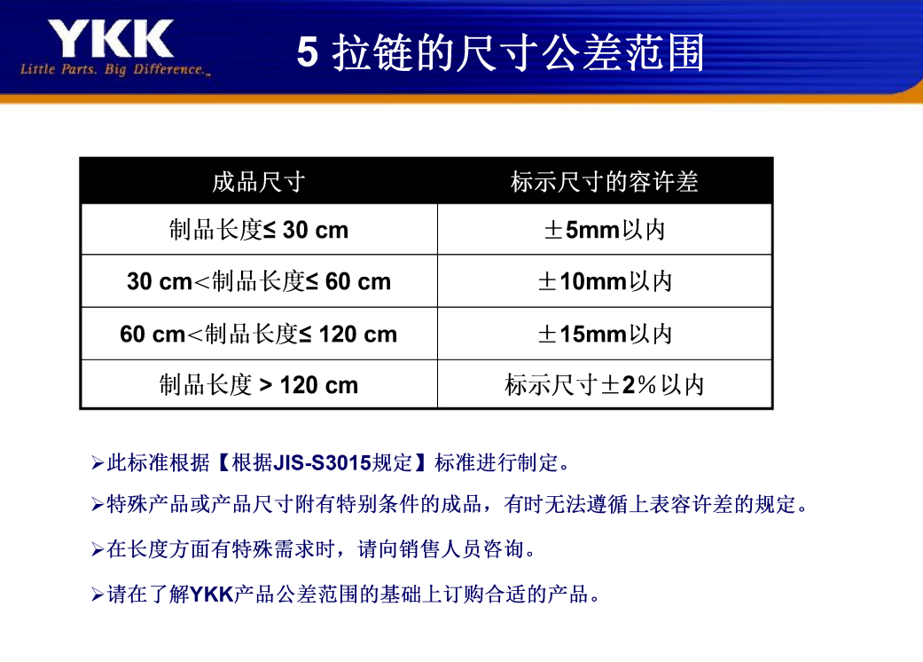 YKK拉链的尺寸公差范围